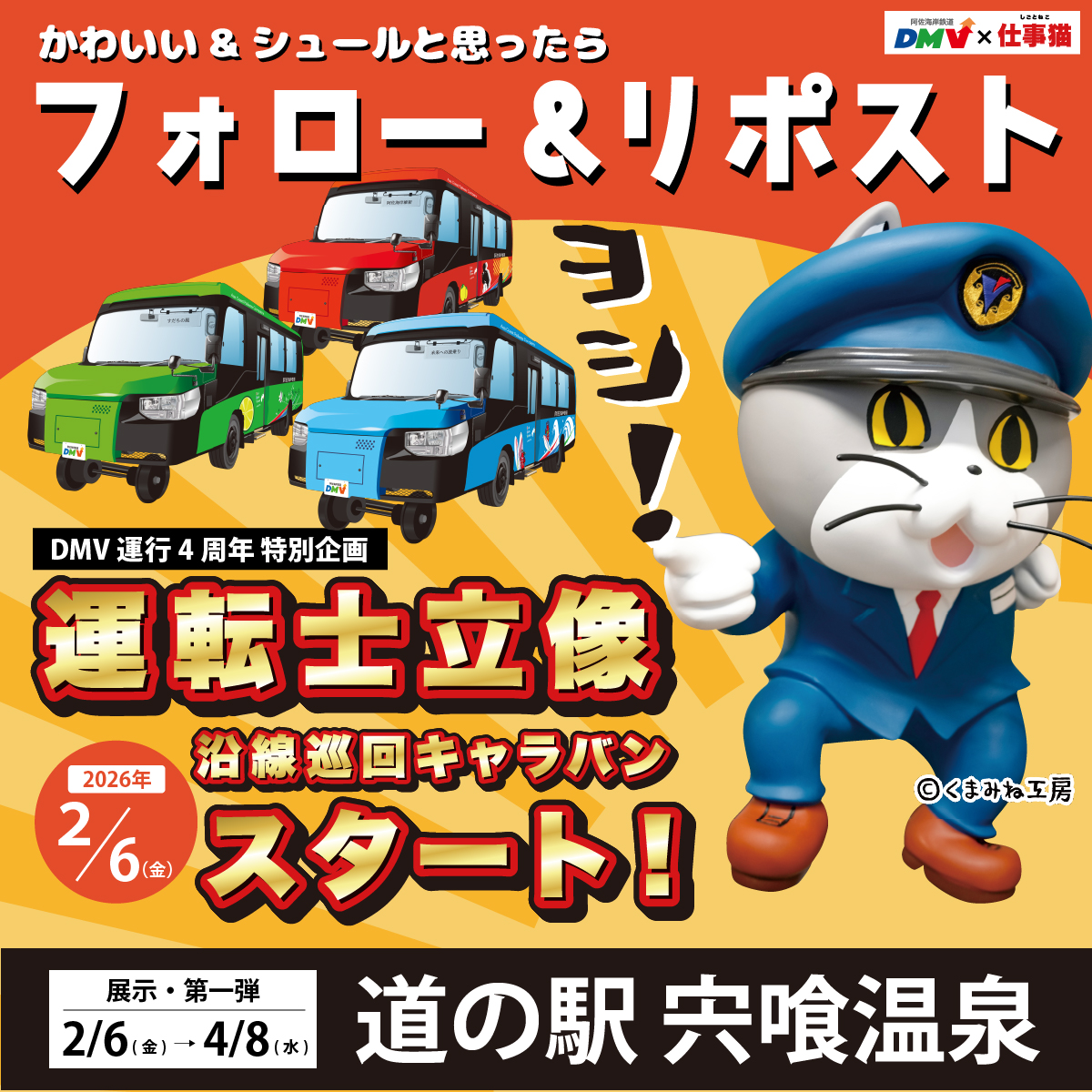 | イベント名 | DMV運行4周年・特別企画 「DMV×仕事猫」運転士・立像沿線巡回キャラバン |