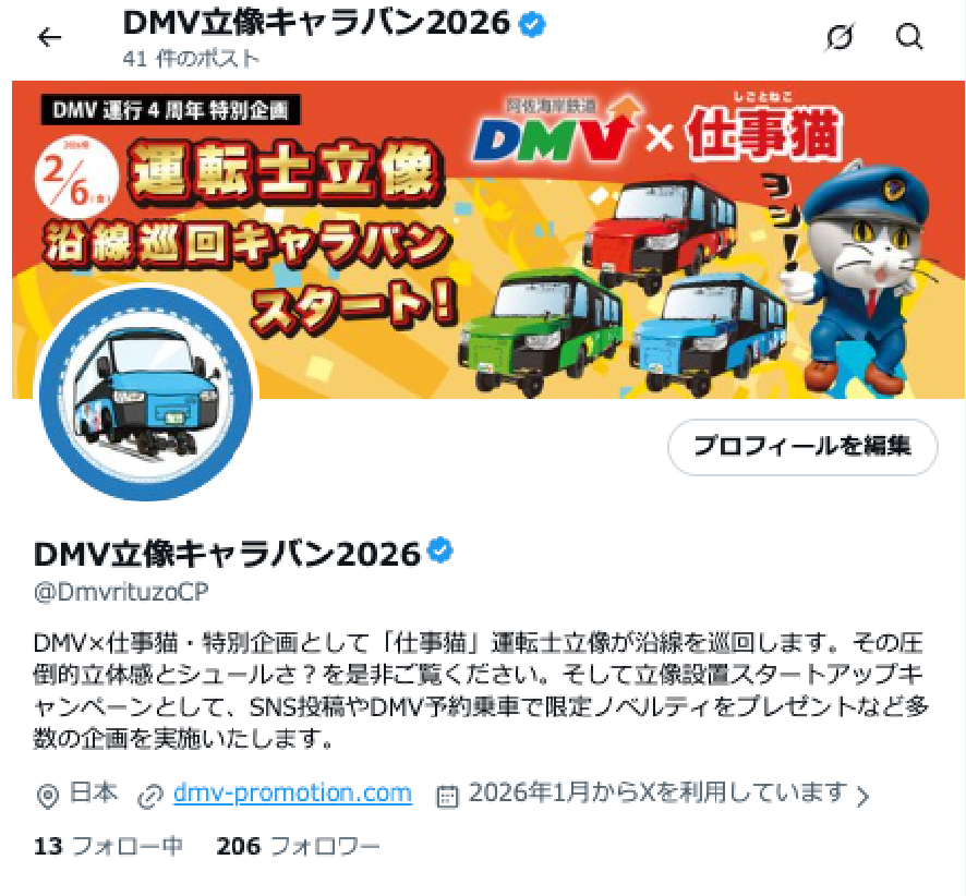 | イベント名 | DMV運行4周年・特別企画 「DMV×仕事猫」運転士・立像沿線巡回キャラバン |